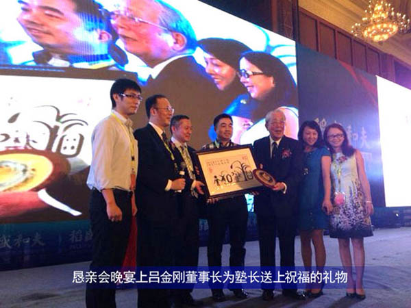 在报告会结束之后,就是例行的“恳亲会”这是稻盛塾长自己亲自规定的,因为在他的经营理念里面,这样有利于听员工的心声和彼此见的一个关系融合。晚宴上成都盛和塾为了表示对塾长的敬意和祝福,吕金刚董事长作为代表向稻盛塾长送上了成都形象标志“太阳神鸟”,并祝愿稻盛塾长吉祥如意、福寿安康。